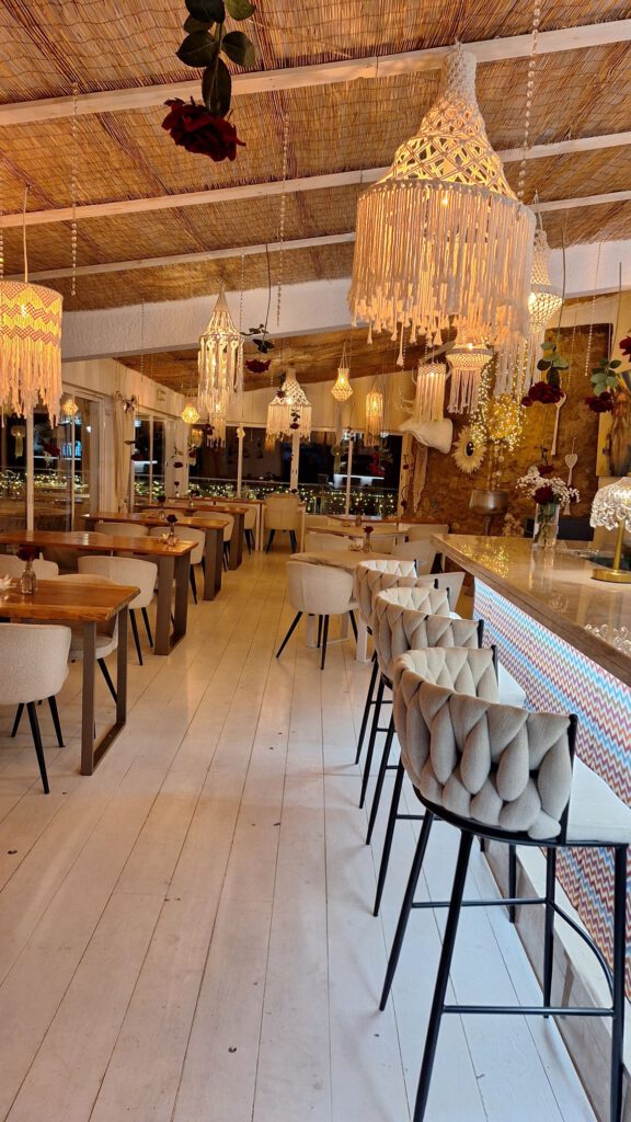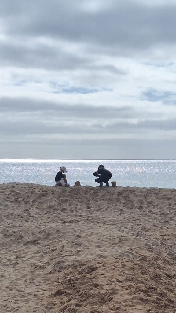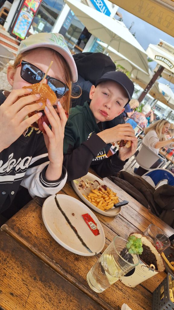 Door naar het terras. De kinderen kunnen lekker het strand op en wij kunnen lekker een drankje doen. Daniel sluit aan en dan gaan we lunchen. Wraps, avocado toast met tomaten, burgers, biertjes, koffie en jus d’orange. Iedereen smult .