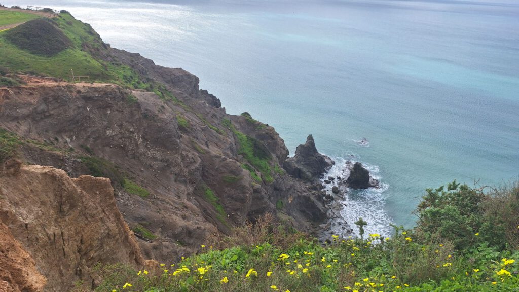 En dan nu naar beneden. We beseffen ons dat naar beneden we een minder steil pad moeten nemen. Dus even zoeken en daar gaan we. Sandra met Tygo voorop en Marijn ,Sterre en ik erachteraan. Dit pad is minder steil en we lopen tussen struikjes naar beneden.
