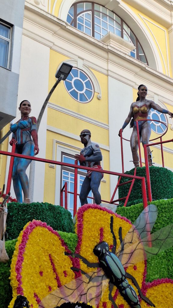 Prachtige karren komen langs, met danseressen die heel schaars gekleed zijn. En zelfs ook dansers. Het thema van het carnval is superhelden en dat zie je overal terug. Er wordt serpentine uitgedeeld ipv snoep en ik heb nog nooit zoveel confetti gezien als hier . Sterre vind het zelfs leuker dan snoep krijgen. (Iedereen die Sterre kent weet dat dit wel wat zegt.) Tygo zit met grote ogen en open mond naar de schaarsgeklede vrouwen te kijken met blote billen en gebodypainte borsten. En thijmen die vind alles mooi. En hoewel hij niet zo happy was omdat hij die dag op zijn tong had gebeten maakte dit alles goed.